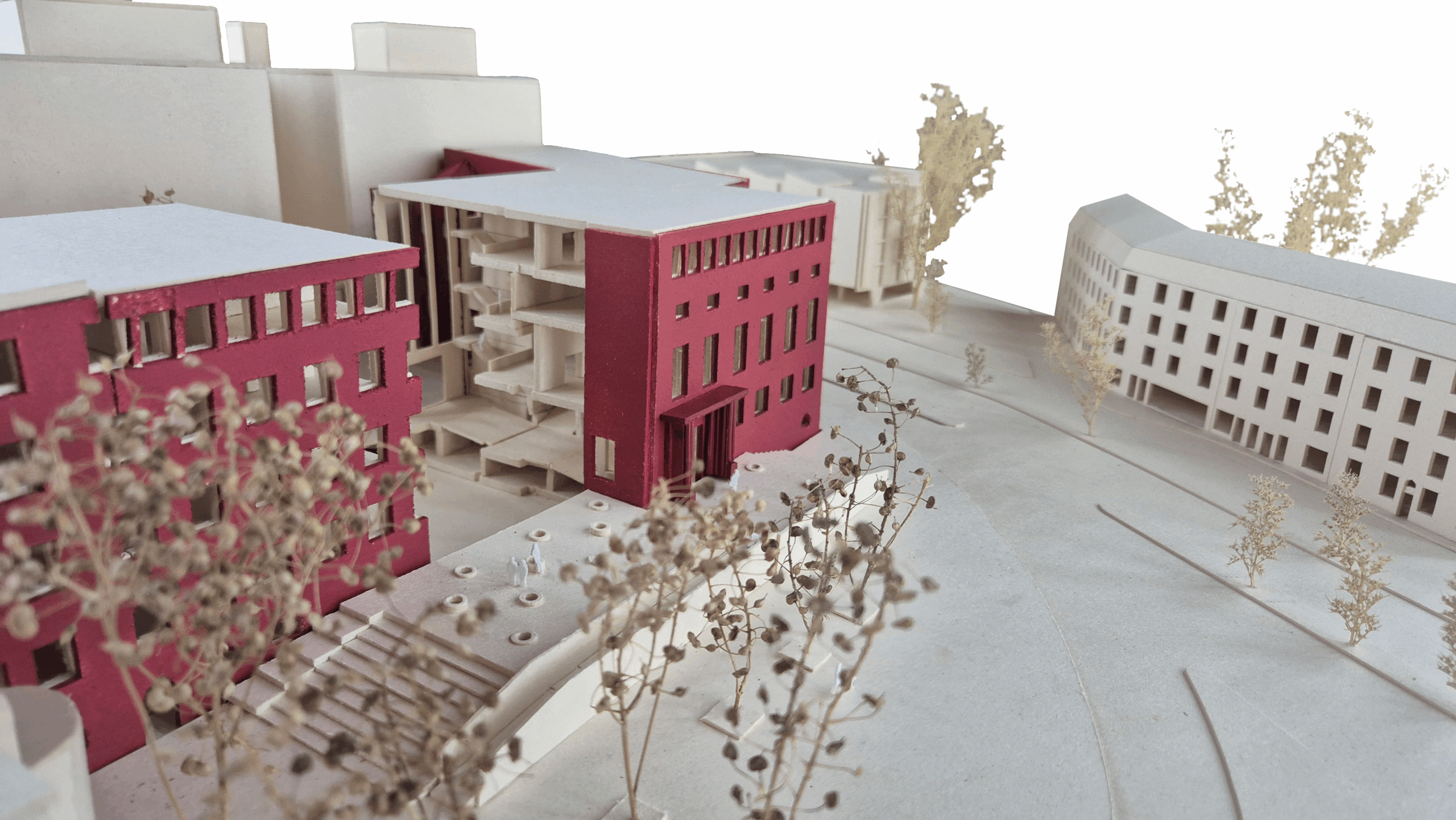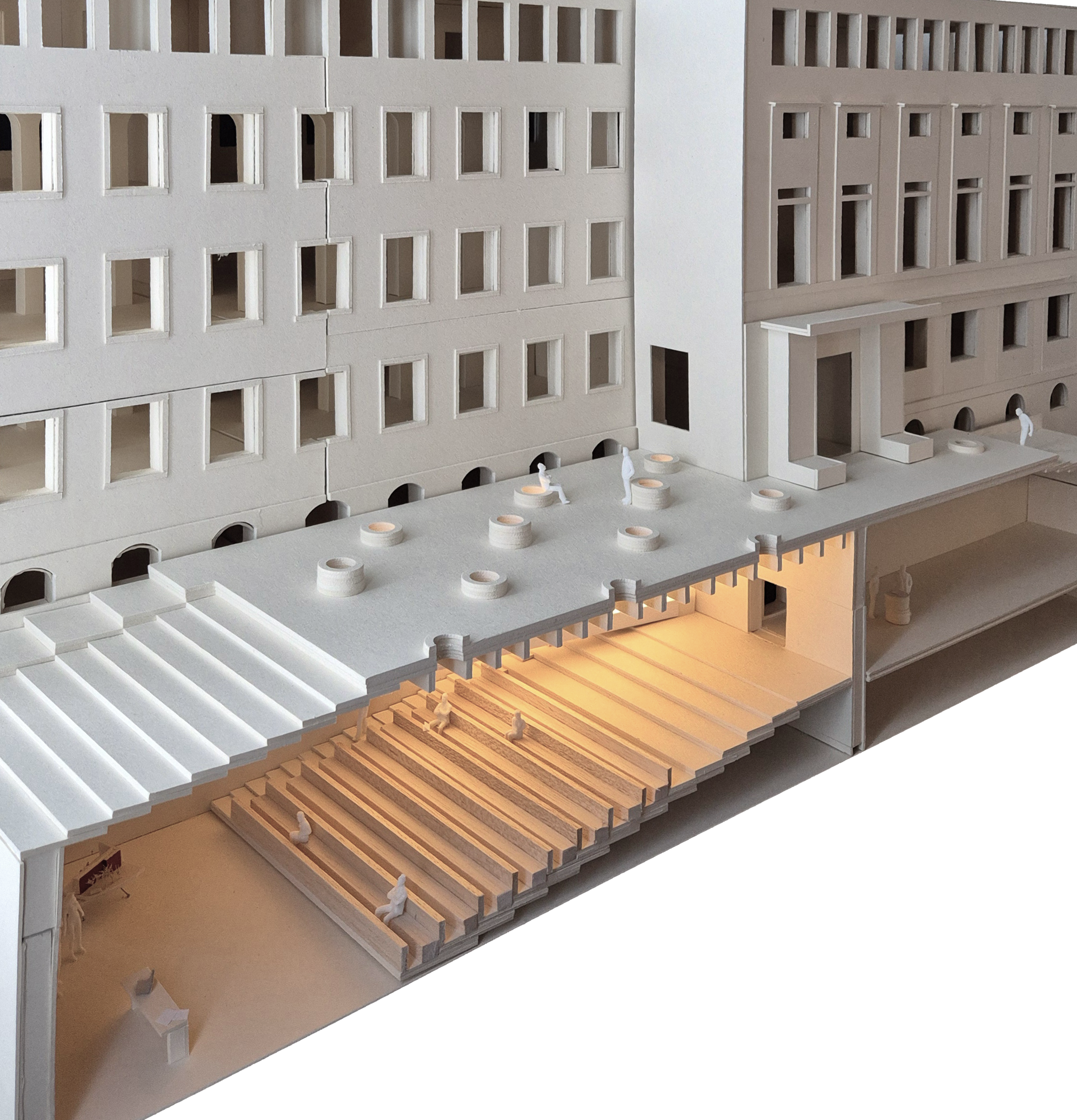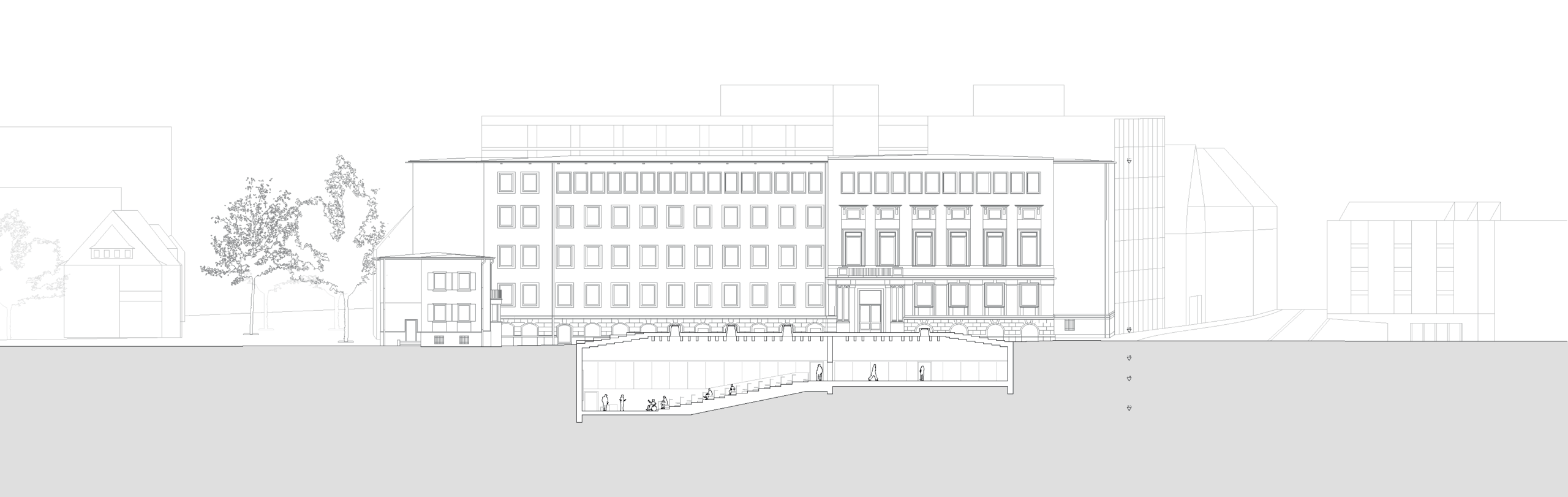 Ausgehend von einer Analyse von Gebäude 9 der Frankfurt University of Applied Sciences, entstand ein Konzept zur räumlichen und funktionalen Weiterentwicklung. Das Gebäude soll weiterhin als Lehrgebäude dienen und in seiner Rolle als Flaggschiff der Hochschule stärker betont werden. Dafür wurde der bislang ungestaltete Vorplatz neu strukturiert und ein Auditorium geplant, das an den bestehenden Keller anschließt. Das Konzept verbindet eine qualitative Aufwertung des Außenraums mit einer gezielten Ergänzung des Gebäudeprogramms.