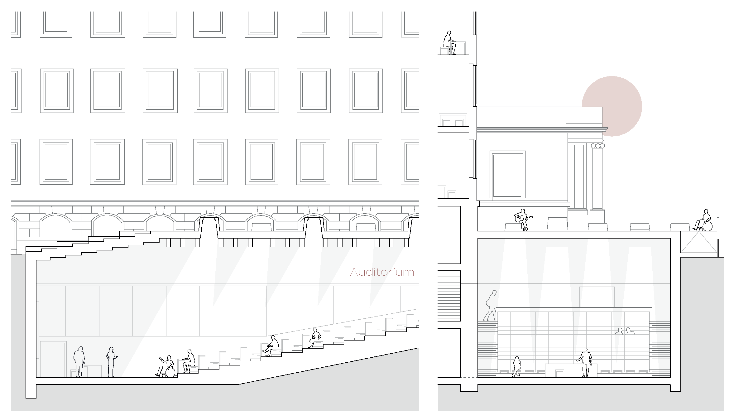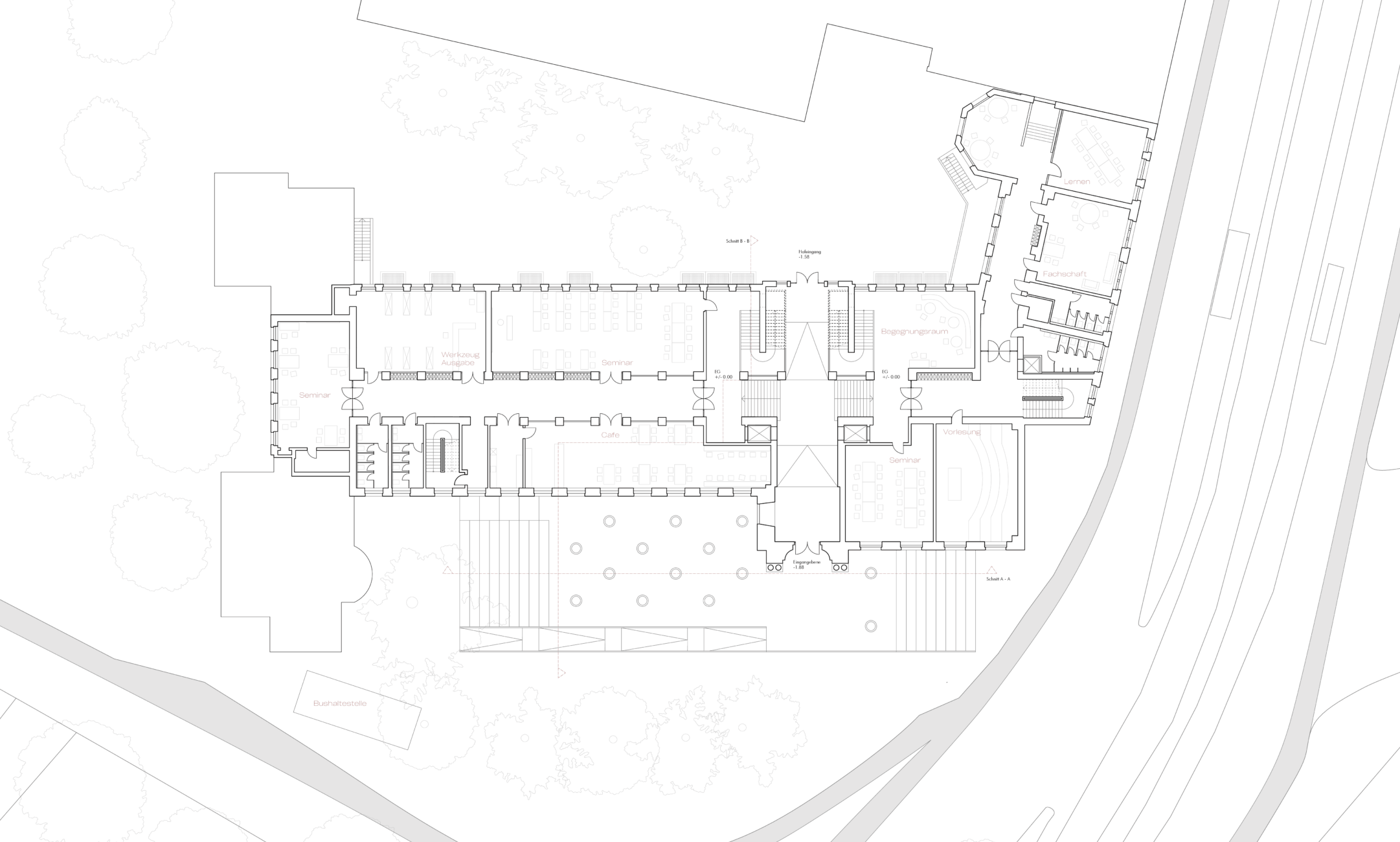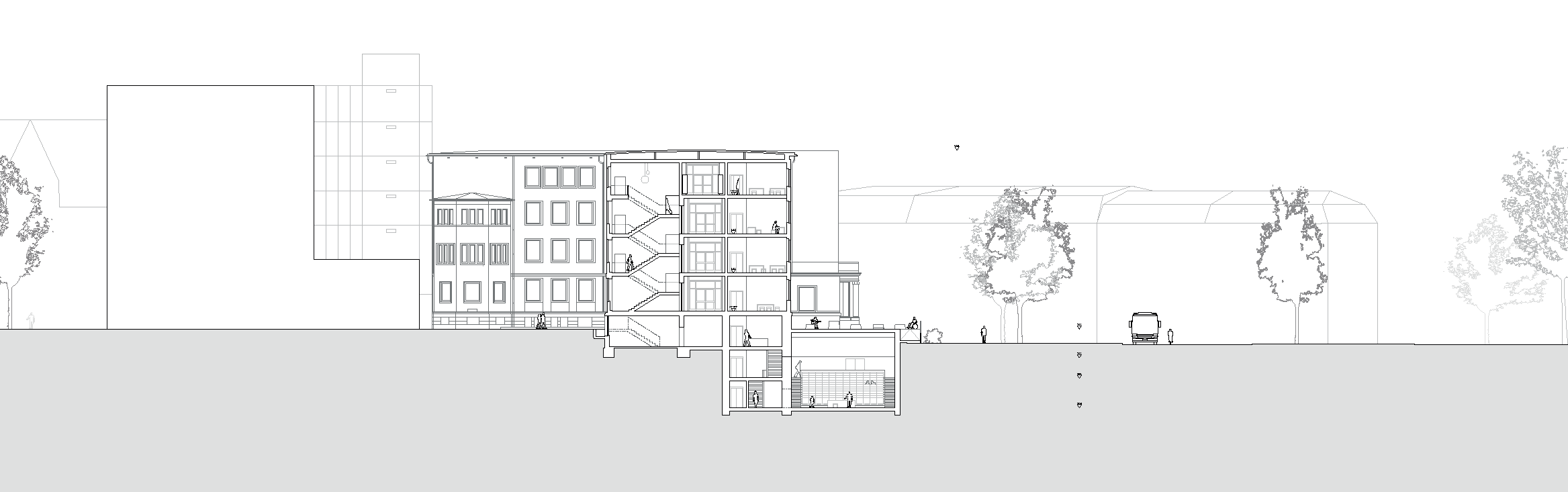 Ausgehend von einer Analyse von Gebäude 9 der Frankfurt University of Applied Sciences, entstand ein Konzept zur räumlichen und funktionalen Weiterentwicklung. Das Gebäude soll weiterhin als Lehrgebäude dienen und in seiner Rolle als Flaggschiff der Hochschule stärker betont werden. Dafür wurde der bislang ungestaltete Vorplatz neu strukturiert und ein Auditorium geplant, das an den bestehenden Keller anschließt. Das Konzept verbindet eine qualitative Aufwertung des Außenraums mit einer gezielten Ergänzung des Gebäudeprogramms.