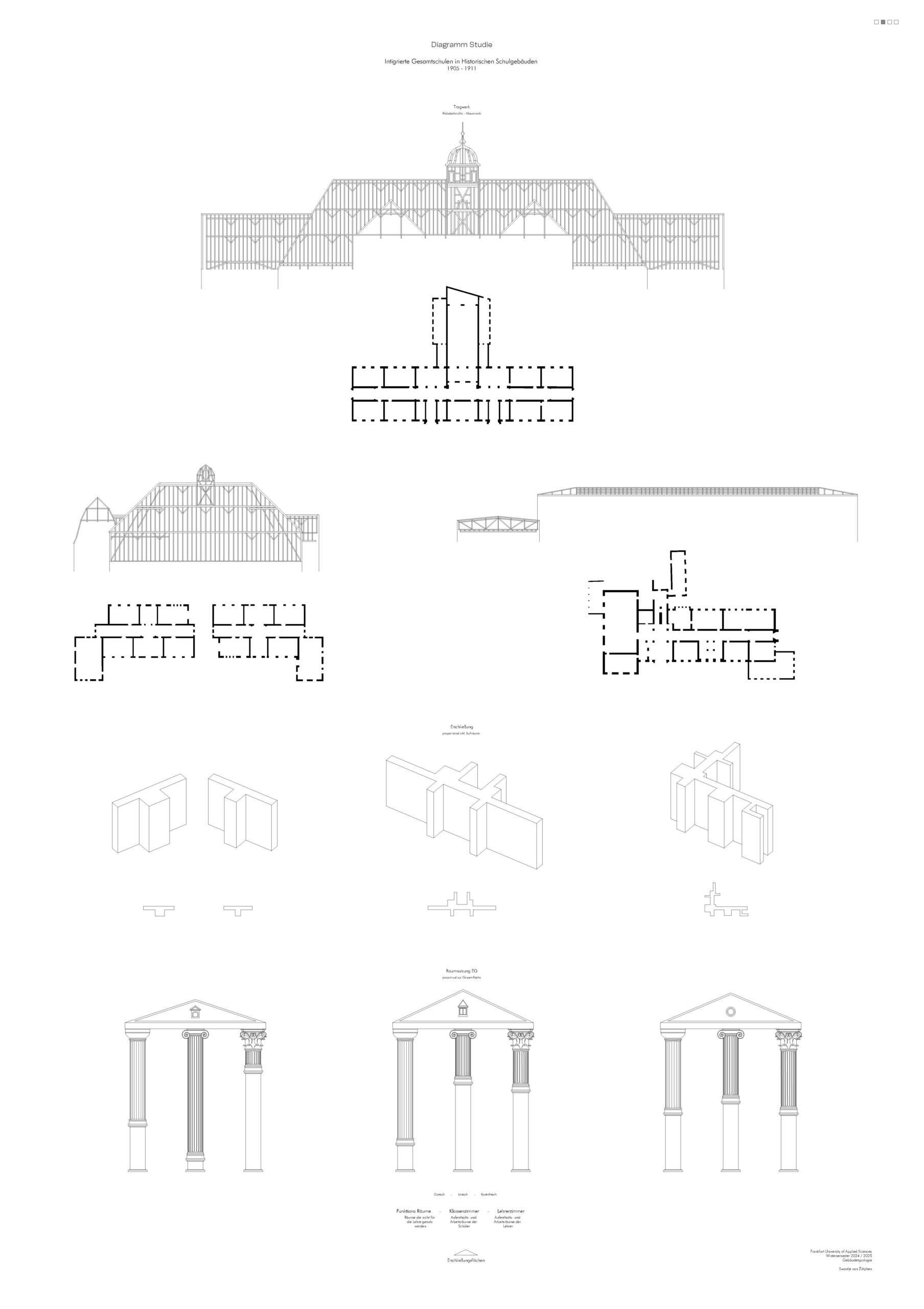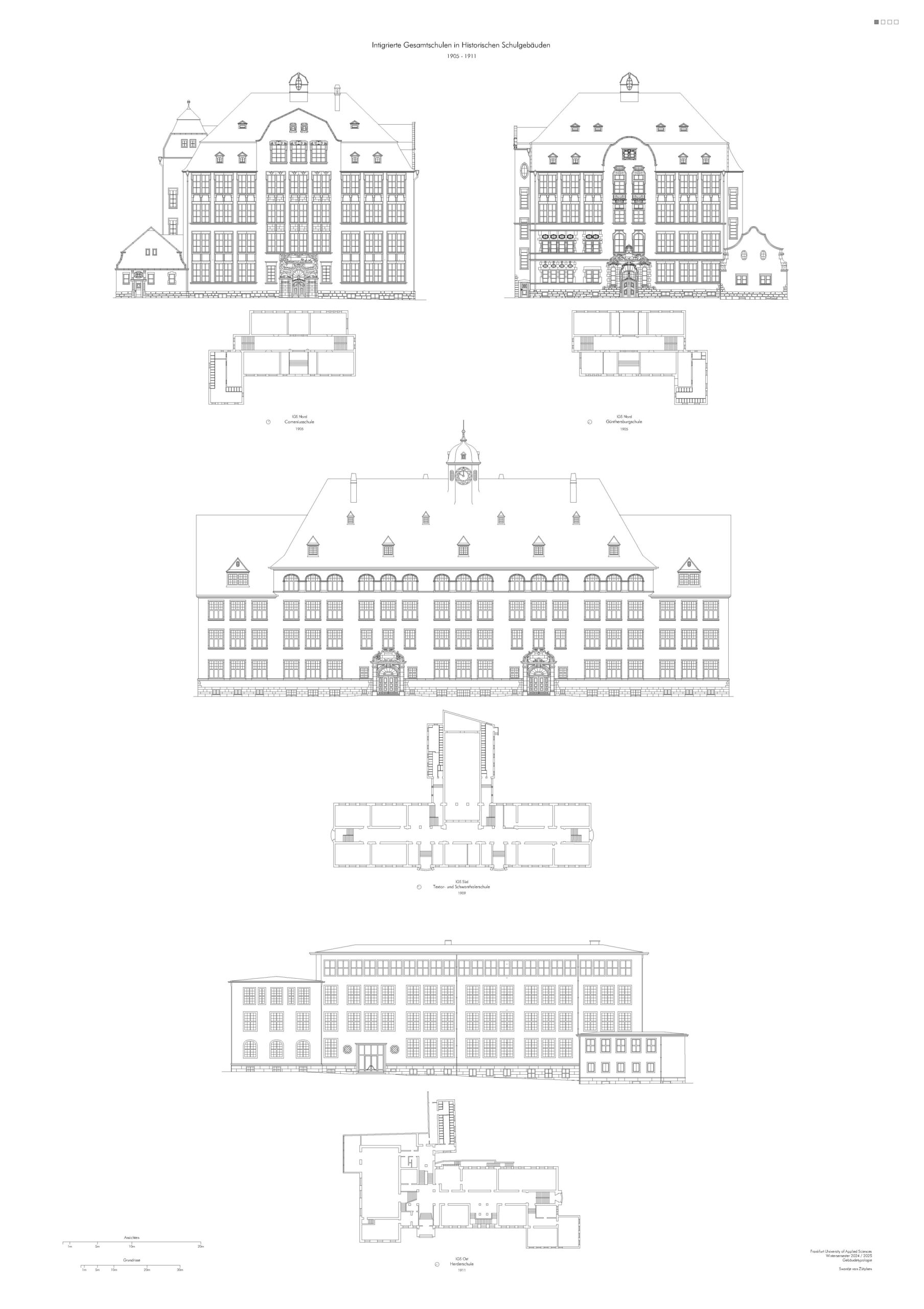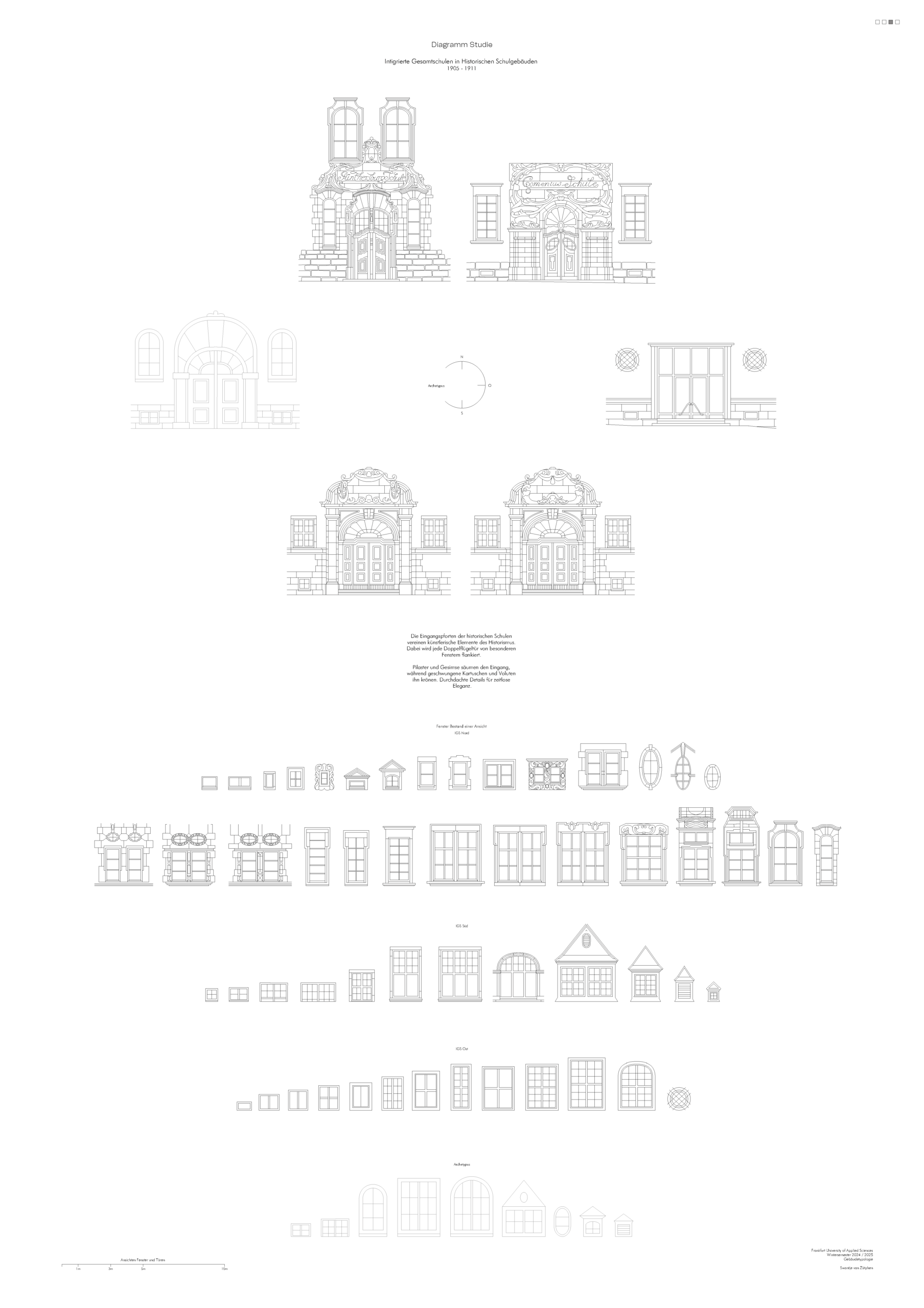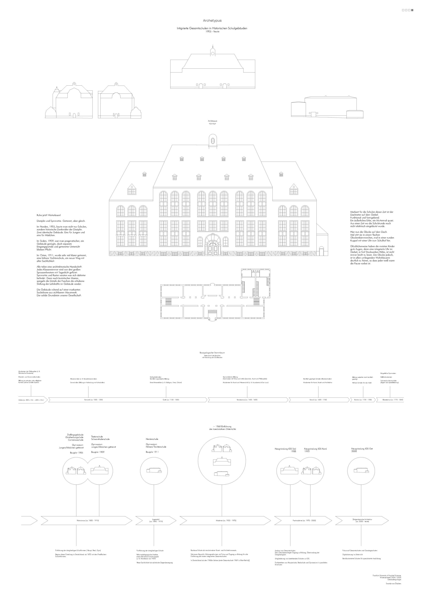 Im Rahmen des Kurses Gebäudetypologie habe ich historische Schulgebäude in Frankfurt am Main untersucht, darunter die IGS Nord, IGS Süd und IGS West. Alle Schulen zeichnen sich durch klare, symmetrische Strukturen, große Sprossenfenster und markante Sockelzonen aus Sichtmauerwerk und Dachreiter mit Glocken aus. Ziel war es, den archetypischen Aufbau und die charakteristischen Merkmale dieser Schulbauten herauszuarbeiten.
